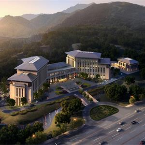 場地內(nèi)用地高差起伏較大,故項目的規(guī)劃布局設計圍繞“依山順勢”的山地建筑思想,結(jié)合三面環(huán)山的自然地貌走勢,以“圍合”與“開放有致”作為主題展開設計;總體布局采用向東開口的“V”字形布局,呼應了周邊山體的走勢,適度的圍合形成項目自身的景觀環(huán)境,同時與東面城市景觀交融互補。