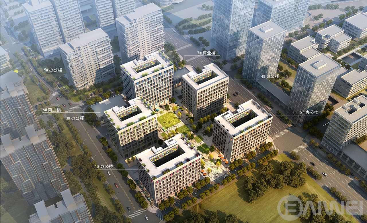 1#~5#樓為8~10層高層辦公樓,6#、7#樓為兩層商業(yè)樓,地下一層為大地盤地下汽車庫。